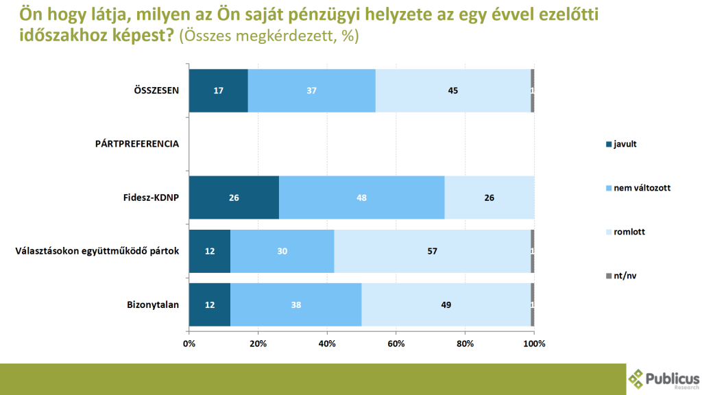 Közel minden hatodik (17 százalék) megkérdezett úgy látja, hogy javult a saját pénzügyi helyzete tavalyhoz képest. Ezt mondta a Fidesz szavazók negyede (26 százalék), a választásokon együttműködő ellenzéki pártok szavazóinak illetve a bizonytalan szavazóknak is a 12-12 százaléka.