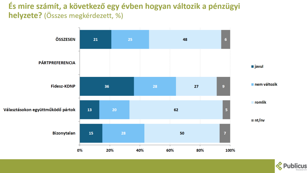 A megkérdezettek ötöde (21 százalék) arra számít, hogy a következő egy évben javulni fog a pénzügyi helyzete. Ezt mondta a Fidesz szavazók harmada (36 százalék), választásokon együttműködő ellenzéki pártok szavazóinak a 13 százaléka, illetve a bizonytalan szavazóknak a 15 százaléka.