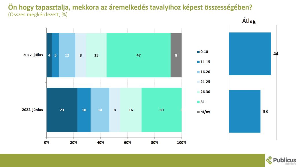Az emberek által érzékelt áremelkedés, az infláció átlagosan júliusban 44 százalékos volt. Ez 11 százalékponttal magasabb, mint az egy hónappal ezelőtt mért érték.