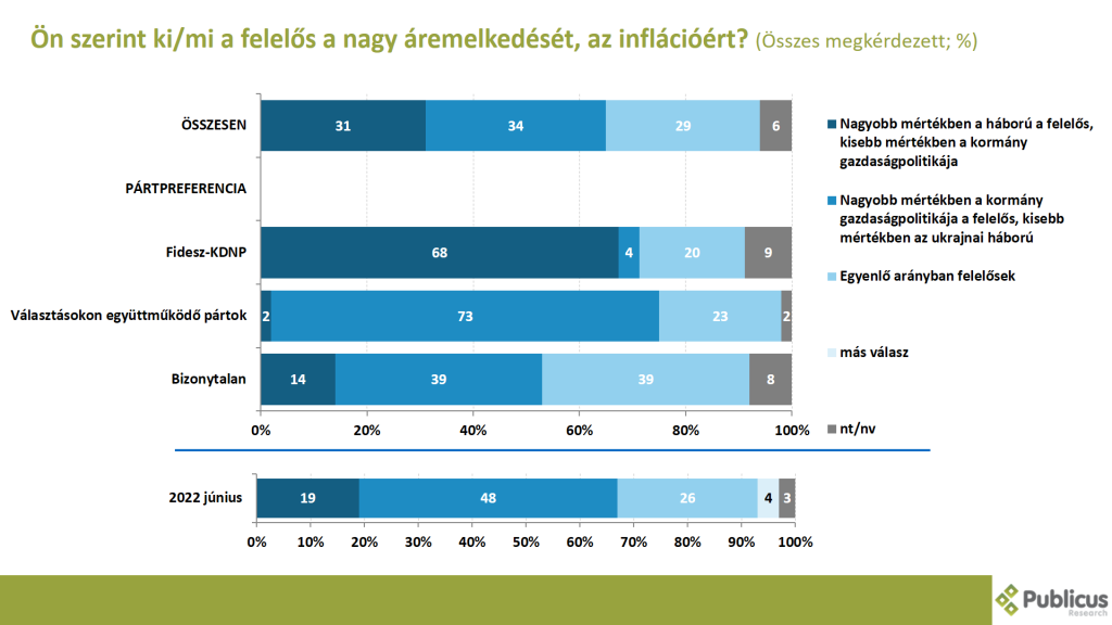 A megkérdezettek harmada (34 százalék) szerint a nagy áremelkedésért, az inflációért nagyobb mértékben a kormány gazdaságpolitikája felelős, kisebb mértékben pedig az ukrajnai háború. Így látja a választásokon együttműködő ellenzéki pártok szavazóinak a háromnegyede (73 százalék), tízből négy (39 százalék) bizonytalan szavazó, illetve a Fidesz szavazóinak a 4 százaléka.