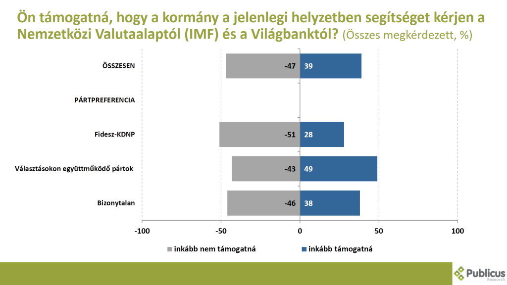 Tízből négy (39 százalék) megkérdezett inkább támogatja, hogy a kormány a jelenlegi helyzetben segítséget kérjen a Nemzetközi Valutalaptól (IMF) és a Világbanktól. Ezt mondta a Választásokon együttműködő ellenzéki pártok szavazóinak a fele (49 százalék) tízből négy (38 százalék) bizonytalan szavazó, illetve tízből három Fidesz szavazó.