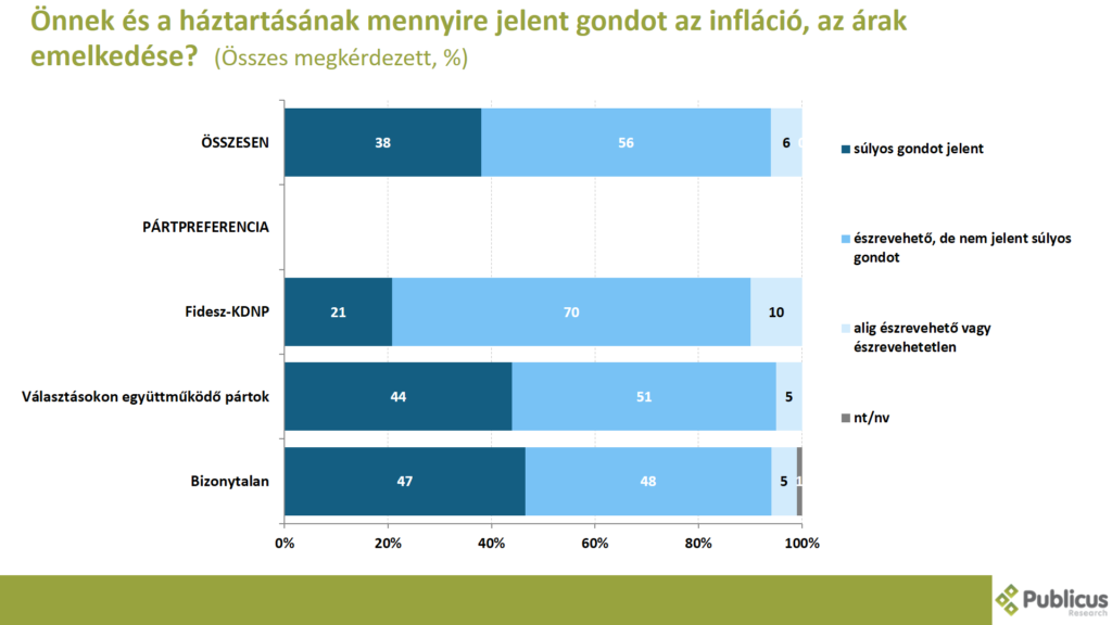 Tízből hat (56 százalék) válaszadó mondta azt, hogy észrevehető, de nem jelent neki súlyos gondot az infláció. Így nyilatkozott tízből hét (70 százalék) Fidesz szavazó, illetve a választásokon együttműködő ellenzéki pártok szavazóinak illetve a bizonytalan szavazóknak a közel fele. (51 és 48 százalék).