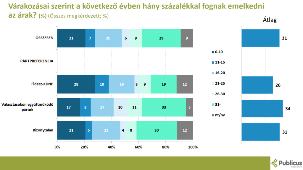 A megkérdezettek várakozási szerint a következő évben átlagosan 31 százalékkal fognak emelkedni az árak. A Fidesz szavazók átlagosan 26 százalékos, a választásokon együttműködő ellenzéki pártok szavazói 34 százalékos, a bizonytalan szavazók pedig 31 százalékos áremelkedéssel számolnak.