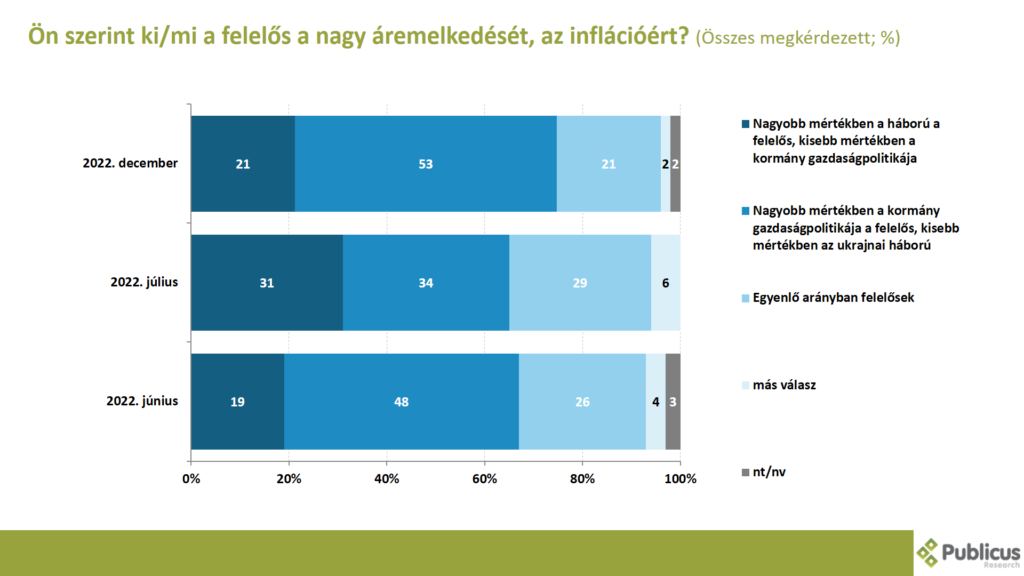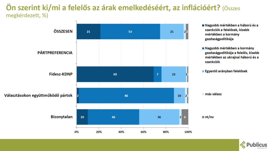 Az enyhe többség (53 százalék) szerint a nagy áremelkedésért, az inflációért nagyobb mértékben a kormány gazdaságpolitikája felelős, kisebb mértékben pedig az ukrajnai háború. Így látja a választásokon együttműködő ellenzéki pártok szavazói közül tízből közel kilenc (86 százalék), tízből öt (46 százalék) bizonytalan szavazó, illetve a Fidesz szavazóinak a 7 százaléka.