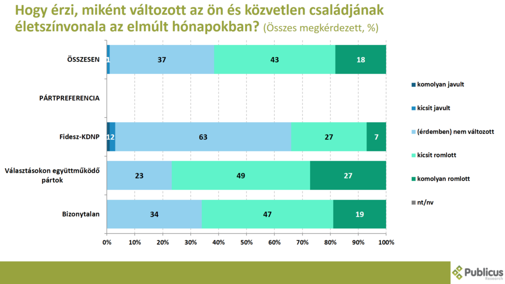 Tízből négy (43 százalék) megkérdezett mondta azt, hogy kicsit romlott neki és közvetlen családjának az életszínvonala az elmúlt hónapokban. Így nyilatkozott bizonytalan szavazók közel fele (47 százalék), a választásokon együttműködő ellenzéki pártok szavazóinak szintén a közel fele (49 százalék), illetve a Fidesz szavazók negyede (27 százalék).