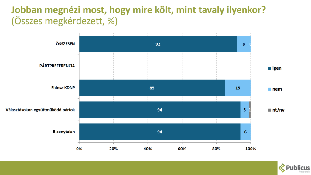 Tízből kilenc (92 százalék) megkérdezett mondta azt, hogy jobban megnézi most, hogy mire költ, mint tavaly ilyenkor. Így nyilatkozott a bizonytalan szavazók, illetve a választásokon együttműködő ellenzéki pártok szavazóinak a 94-94 százaléka, továbbá a Fidesz szavazók 85 százaléka.