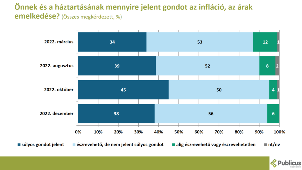 2022 októberéhez képest 7 százalékponttal csökkent azok aránya, akik azt mondták, hogy súlyos gondot jelent nekik az infláció (egyúttal azonban a mostani 38 százalékos arány 4 százalékponttal magasabb mint a 2022 márciusában volt, még az országgyűlési választás előtt)