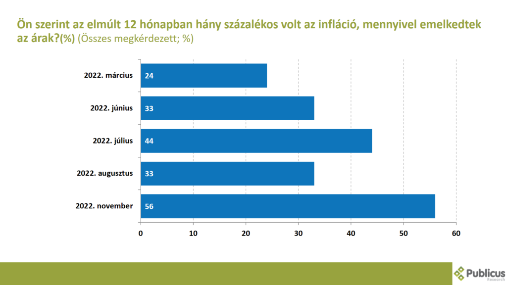 Az emberek által érzékelt áremelkedés, az infláció átlagosan novemberben 56 százalékos volt. Ez az arány 23 százalékponttal magasabb, mint az augusztusi, illetve már 32 százalékponttal, mint a márciusi (országgyűlési választás előtt) mért számok. A válaszadók várakozási szerint a következő évben átlagosan 31 százalékkal fognak emelkedni az árak.