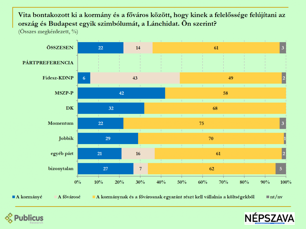 Tízből hat (61 százalék) megkérdezett szerint a kormánynak és a fővárosnak egyaránt a felelőssége felújítani a Lánchidat. Minden ötödik (22 százalék) válaszadó szerint azonban a kormányé, illetve minden hetedik (14 százalék) szerint a fővárosé a felelősség, hogy felújítsák Magyarország és Budapest egyik legfontosabb szimbólumát.