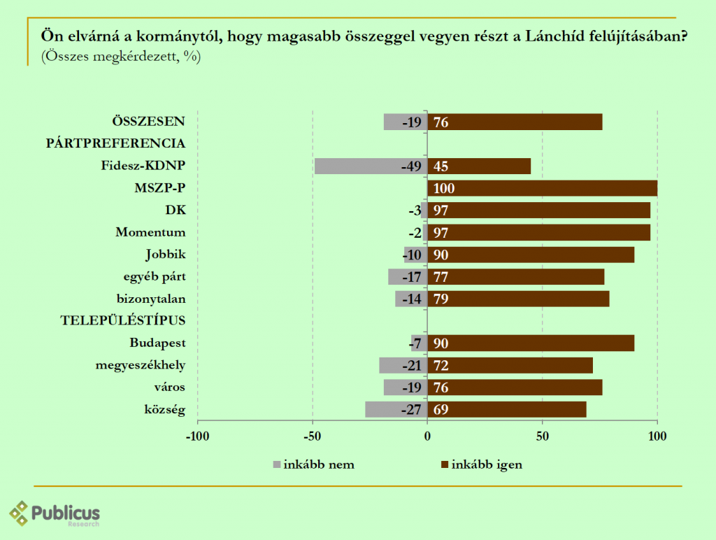 A Fidesz szavazók megosztottak a kérdésben, közel egyik felük (45 százalék) elvárná a kormánytól, hogy magasabb összeggel vegyen részt a Lánchíd felújításában, míg közel másik felük (49 százalék) ezt nem várja el a kormánypárttól.