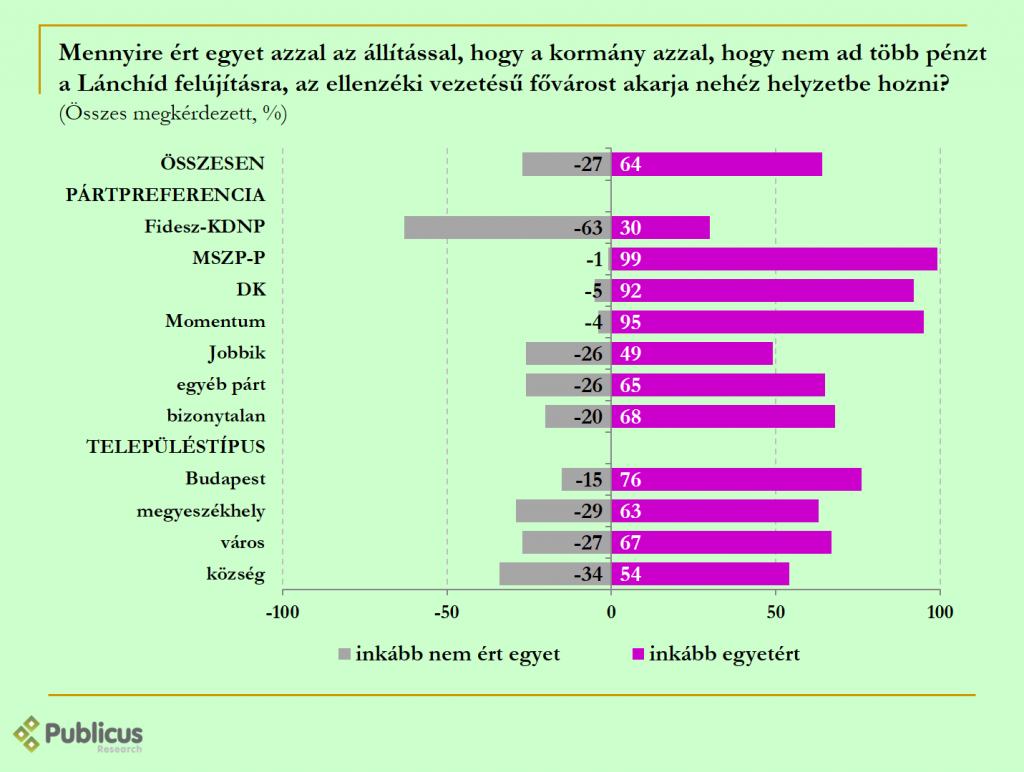 A válaszadók közel kétharmada (64 százalék) inkább egyetért azzal az állítással, hogy a kormány azzal, hogy nem ad több pénzt a Lánchíd felújítására, az ellenzéki vezetésű fővárost akarja nehéz helyzetbe hozni. Így gondolják főleg az MSZP-P (99 százalék) és a Momentum (95 százalék) szavazói.