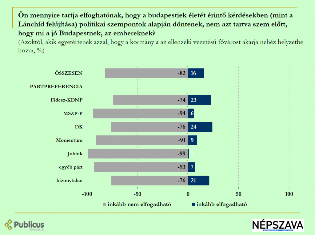 Azok körében, akik szerint a kormány Budapest vezetését nehéz helyzetbe kívánja hozni, tízből nyolc megkérdezett (82 százalék) tartja elfogadhatatlannak azt, hogy a budapestiek életét érintő kérdésekben (mint például a Lánchíd felújítása) politikai szempontok alapján döntenek, nem azt tartva szem előtt, mi a jó Budapestnek, az embereknek. A Fidesz szavazók közel ugyanilyen arányban (74 százalék) tartják elfogadhatatlannak mindezt.