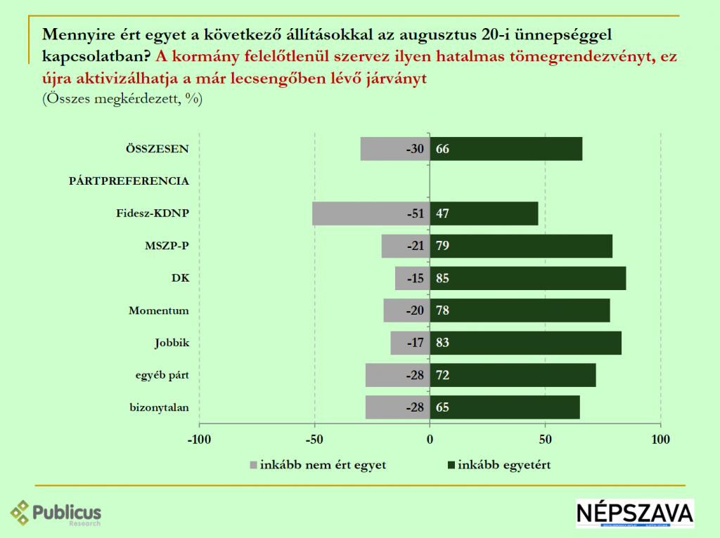 Leginkább a DK (85 százalék), és a Jobbik (83 százalék) szavazói látják így, de a Fidesz szavazók közel fele (47 százalék) is inkább egyetért azzal, hogy a kormány felelőtlenül járna el, ha megrendezné az augusztus 20-i rendezvényeket.