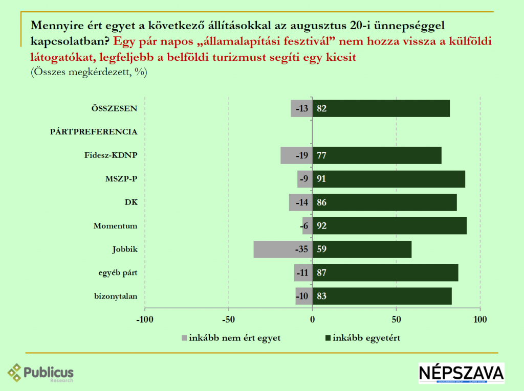 Tízből nyolc (82 százalék) válaszadó inkább egyetért azzal, hogy egy pár napos „államalapítási fesztivál” nem hozza vissza a külföldi látogatókat, legfeljebb a belföldi turizmust segíti egy kicsit. Főleg a Momentum (92 százalék) és az MSZP-P (91 százalék) szavazói látják így.
