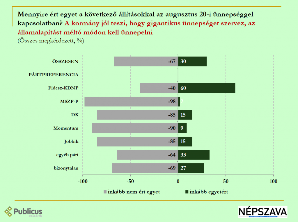 A válaszadók kétharmada (67 százalék) inkább nem ért egyet azzal a megállapítással, hogy a kormány jól teszi, hogy gigantikus ünnepséget szervez, mivel az államalapítást méltó módon kell megünnepelni. Leginkább az MSZP-P (98 százalék), és a Momentum (90 százalék) szavazói látják így,