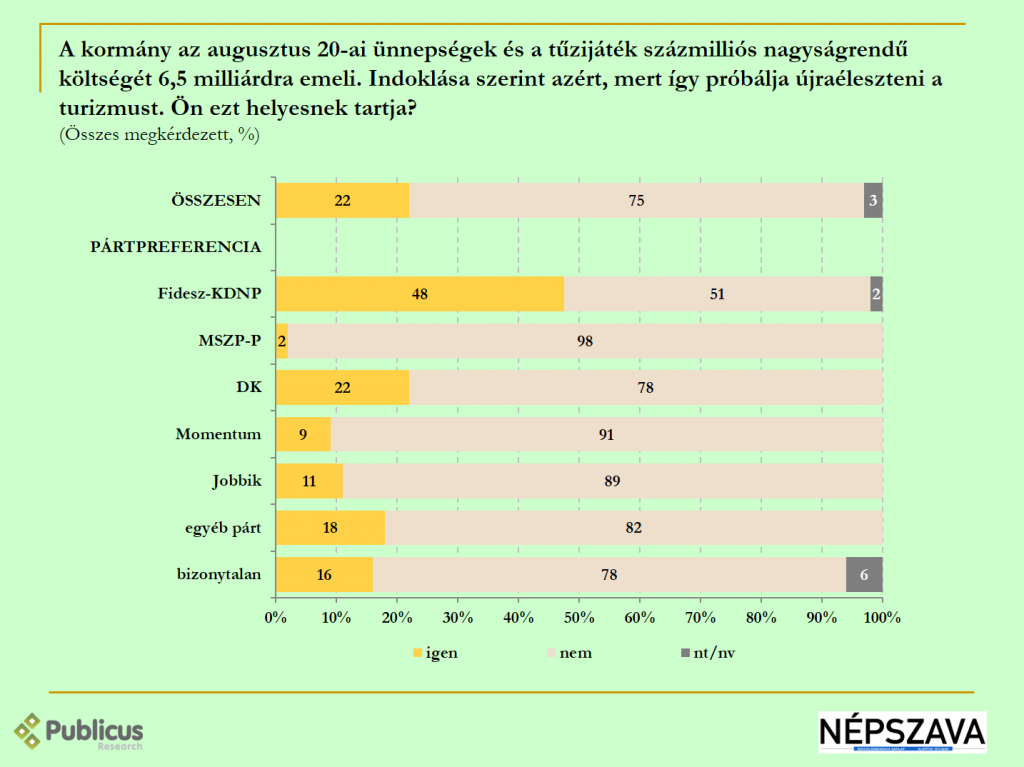 A megkérdezettek háromnegyede (75 százalék) nem tartja helyesnek azt, hogy a kormány az augusztus 20-i ünnepségek és a tűzijáték százmilliós nagyságrendű költségét 6,5 milliárdra emeli. Főleg az MSZP-P (98 százalék) és a Momentum (91 százalék) szavazói látják így.