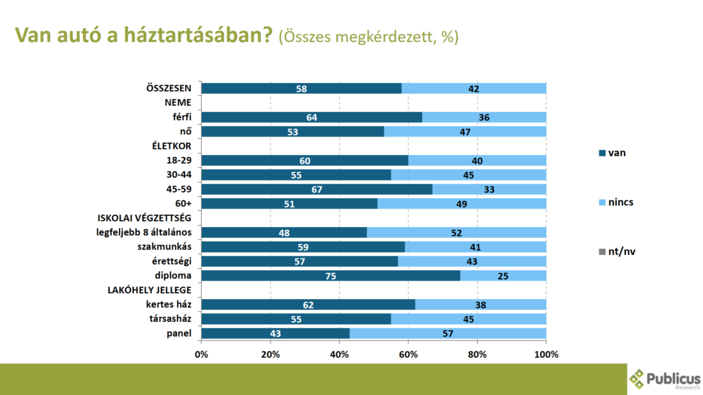 Tízből hat (58 százalék) válaszadó mondta azt, hogy van autó a háztartásában. Leginkább a diplomások (75 százalék), a 45-59 év közöttiek (67 százalék) és a férfiak (64 százalék) mondták ezt.