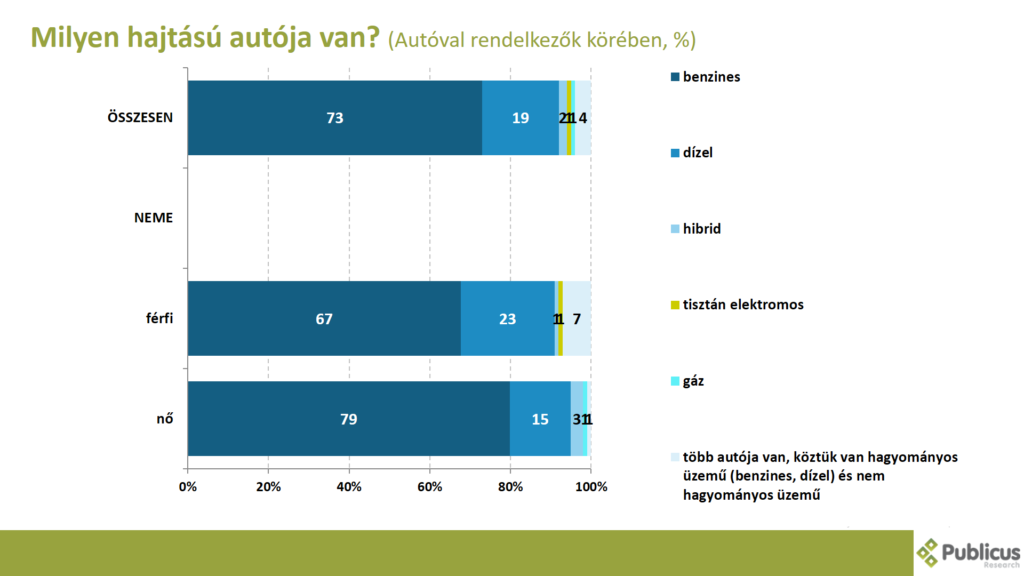 Azok körében, akiknek van autója, a megkérdezettek háromnegyedének (73 százalék) benzines, ötödének (19 százalék) dízeles, 2 százalékának hibrid, 1 százalékának tisztán elektromos, 1 százalék gáz meghajtású kocsival rendelkezik. 4 százalék mondta azt, hogy több autója van, köztük hagyományos üzemű (benzines, dízel) és nem hagyományos üzemű.