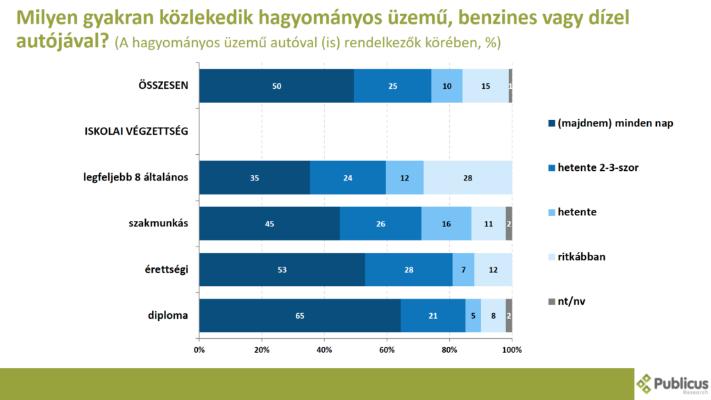 Azok közül, akik hagyományos üzemű autóval (is) rendelkeznek, minden második válaszadó mondta azt (50 százalék), hogy majdnem minden nap közlekedik a kocsijával. Leginkább a diplomások (65 százalék) és az érettségizettek (53 százalék) mondták ezt.
