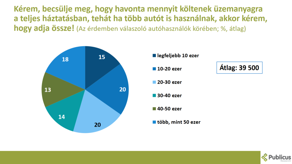 A válaszadók ötöde (20 százalék) 10-20 ezret, szintén ötöde (20 százalék) 20-30 ezret, közel ötöde (18 százalék) több, mint 50 ezret, 15 százaléka legfeljebb 10 ezret, 14 százalék 30-40 ezret, 13 százalék 40-50 ezret költ üzemanyagra a teljes háztartásban. (Több autó használása esetén az összegek összeadódnak).