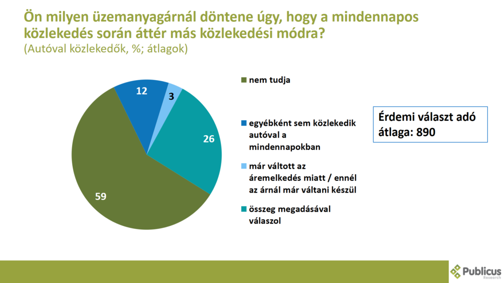 A megkérdezettek (azok közül, akik autóval közlekednek, illetve érdemi választ is adtak) átlagosan 890 forintos üzemanyagárnál döntenének úgy, hogy a mindennapos közlekedés során áttérnek más közlekedési módra. (2023 januárjában még 937 forint volt ez az összeg).
