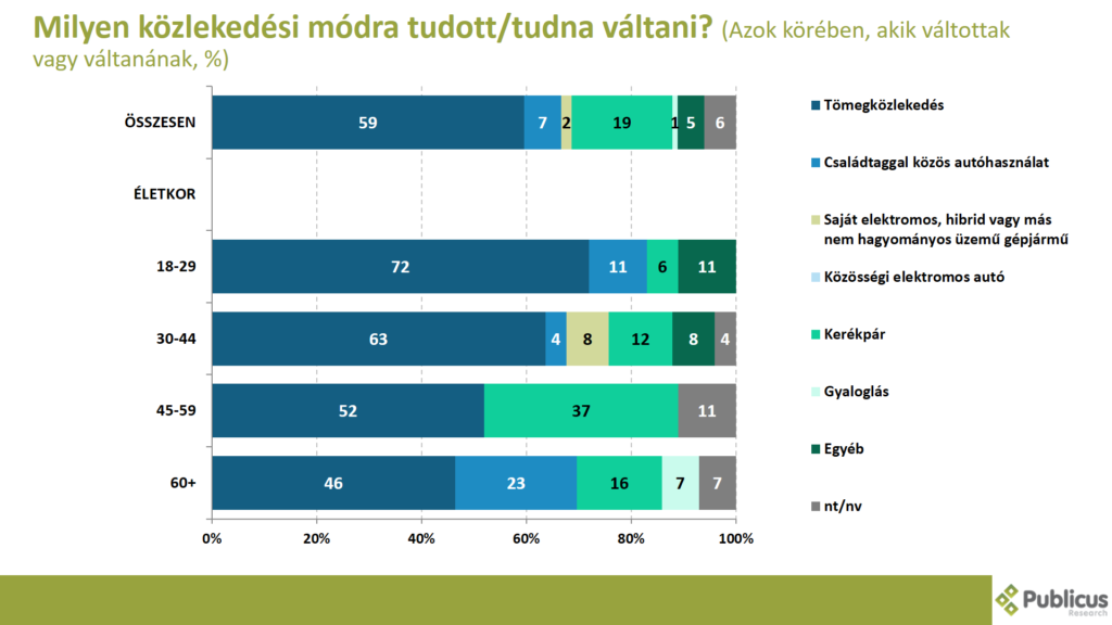 Azok körében, akik váltottak, vagy váltanának más közlekedési módra, tízből hatan (59 százalék) mondták azt, hogy a tömegközlekedésre váltanának. Leginkább a 18-29 év közöttiek (72 százalék) döntenének így.