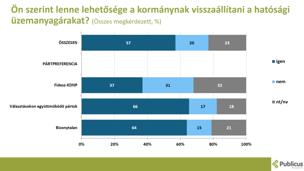Tízből közel hat (57 százalék) válaszadó szerint lenne lehetősége a kormánynak visszaállítani a hatósági üzemanyagárakat. Így gondolja a választásokon együttműködő ellenzéki pártok szavazóinak és a bizonytalan szavazóknak a kétharmada (66-64 százalék), illetve tízből közel négy (37 százalék) Fidesz szavazó.