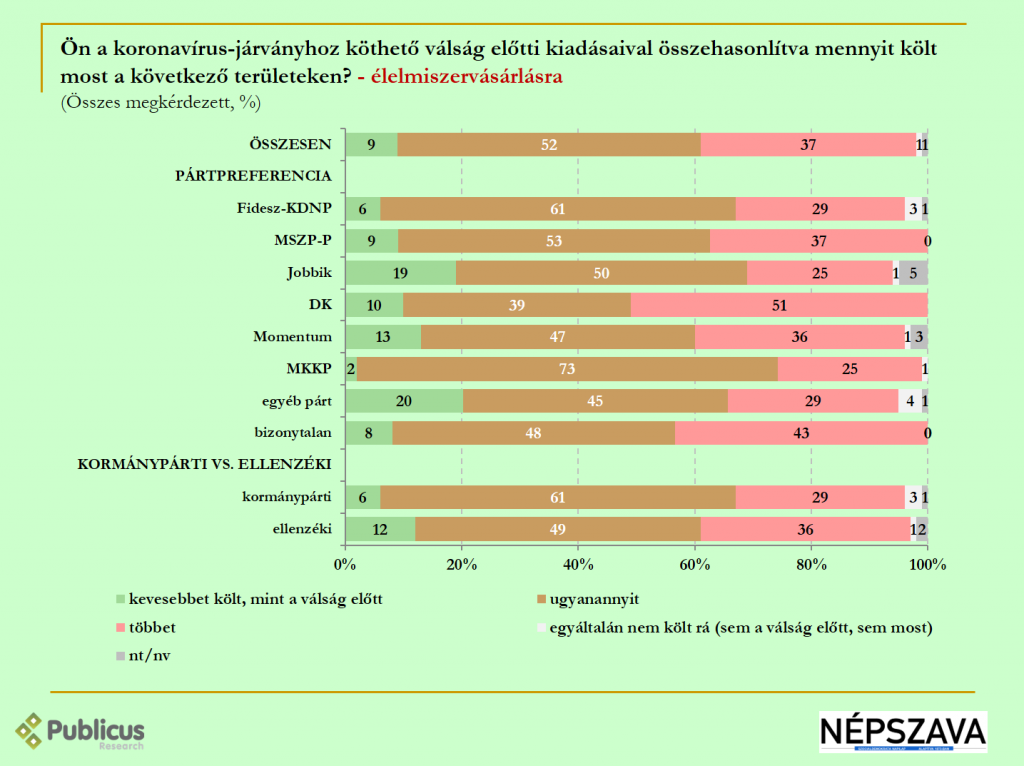 Átlagosan hét százalékkal költ többet most élelmiszerre egy ellenzéki, mint egy kormánypárti szavazó. Leginkább a DK (51 százalék) és a bizonytalan (43 százalék) szavazók mondták azt, hogy most többet kell költeniük élelmiszerre koronavírus-járványhoz köthető válság előtti kiadásaikhoz viszonyítva.