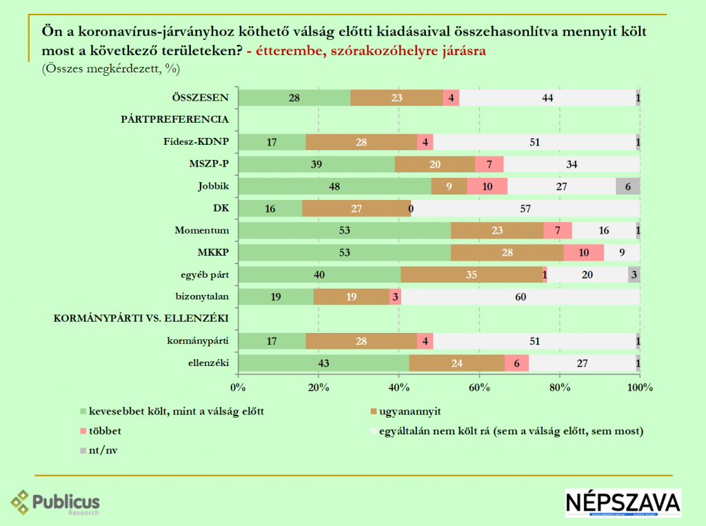 Tízből három (28 százalék) válaszadó mondta azt, hogy most kevesebbet költ étterembe, szórakozóhelyre járásra a koronavírus-járványhoz köthető válság előtti kiadásaival összehasonlítva. Tízből kettő (23 százalék) megkérdezett most is ugyanannyit költ ezekre a dolgokra