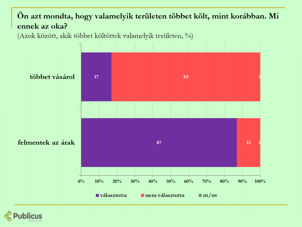 Azok közül, akik azt mondták, hogy valamelyik területen többet költenek most mint a koronavírus-járványhoz köthető válság előtt, tízből kilencen mondták azt, hogy ez azért van, mert felmentek az árak, tízből ketten pedig azt, hogy ez azért van, mert többet is vásárolnak.