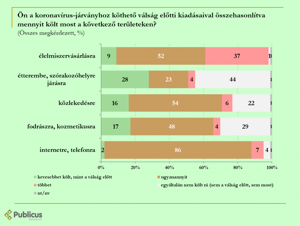 Tízből négy megkérdezett mondta azt, hogy most többet kell költenie élelmiszerre, mint a válság előtt. Ezzel együtt tízből három válaszadó mondta azt, hogy most kevesebbet költ étterembe, szórakozóhelyre járásra a koronavírus-járványhoz köthető válság előtti kiadásaival összehasonlítva. Minden hatodik válaszadó a közlekedésre, illetve közel minden hatodik válaszadó pedig fodrászra, kozmetikusra költ kevesebbet, mint korábban.