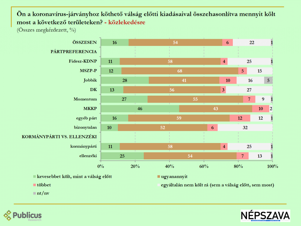 Az ellenzéki szavazók negyede (25 százalék) mondta azt, hogy most kevesebbet költ közlekedésre a koronavírus-járványhoz köthető válság előtti kiadásaival összehasonlítva (ez a Fidesz szavazóknál 11 százalék). A kormánypárti szavazók negyede (25 százalék) mondta azt, hogy egyáltalán nem költ közlekedésre, sem a válság előtt, sem most) – szemben az ellenzéki szavazók 13 százalékával.