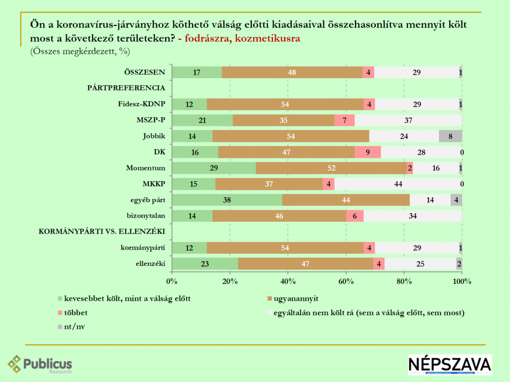 Az ellenzéki szavazók negyede (23 százalék) mondta azt, hogy most kevesebbet költ fodrászra, kozmetikusra a koronavírus-járványhoz köthető válság előtti kiadásaival összehasonlítva. A kormánypárti szavazóknál ez az arány 12 százalék.