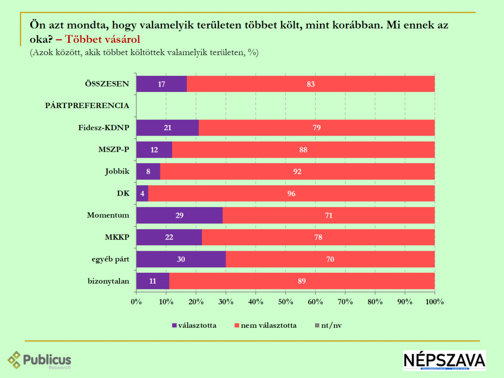 Azok közül, akik azt mondták, hogy valamelyik területen többet költenek most mint a koronavírus-járványhoz köthető válság előtt, tízből ketten (17 százalék) mondták azt, hogy ez azért van, mert többet is vásárolnak. Így nyilatkoztak leginkább a Momentum (29 százalék), az MKKP (22 százalék) és a Fidesz szavazói (21 százalék).