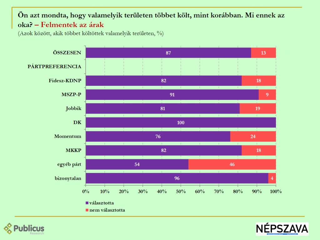 Akik azt mondták, hogy valamelyik területen többet költenek most mint a koronavírus-járványhoz köthető válság előtt, tízből kilencen (87 százalék) mondták azt, hogy ez azért van, mert felmentek az árak. A többletkiadásait az összes megkérdezett DK-s választó magyarázta az árak emelkedésével, továbbá tízből nyolc (82 százalék) Fidesz szavazó is azért költ többet, mert felmentek az árak.