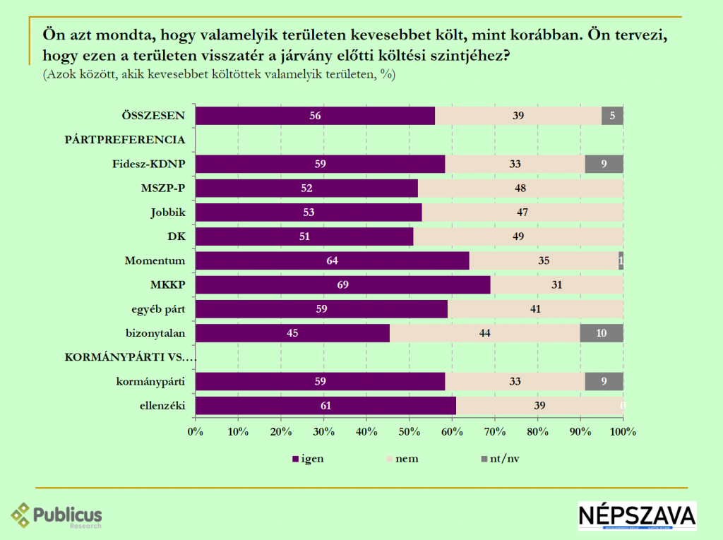 Akik arról nyilatkoztak, hogy most valamelyik területen kevesebbet költenek mint a koronavírus-járványhoz köthető válság előtt, tízből hatan (56 százalék) mondták azt, hogy tervezik szerint ugyanannyit szeretnének költeni, mint korábban. Tízből négyen (39 százalék) mondták azt, hogy nem terveznek visszatérni a járvány előtti költési szintjükhöz.