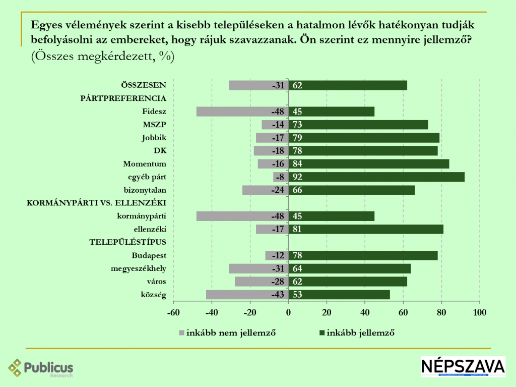 Leginkább az egyéb pártok (92 százalék), a Momentum (84 százalék), illetve a Jobbik (79 százalék) szavazói gondolkodnak így. Míg egyedül a Fidesz szavazók gondolják azt másként (48 százalék, 45 ellenében); szerintük nem jellemző, hogy a kisebb településeken a hatalmon lévők hatékonyan tudják befolyásolni az embereket, hogy rájuk szavazzanak.