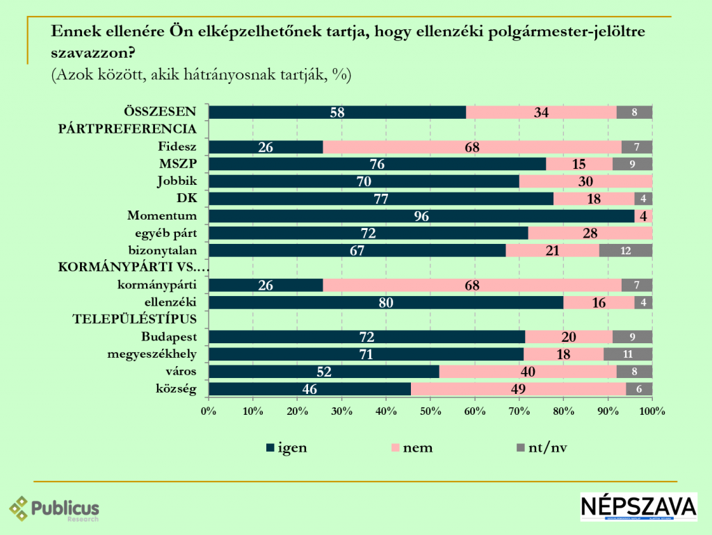 Mindazonáltal tíz olyan megkérdezett közül, akik valamennyire hátrányosnak tartják a nem kormánypárti település-vezetést, hatan (58 százalék) el tudják képzelni, hogy ellenzék polgármester-jelöltre szavazzanak, míg harmaduk (34 százalék) nem.