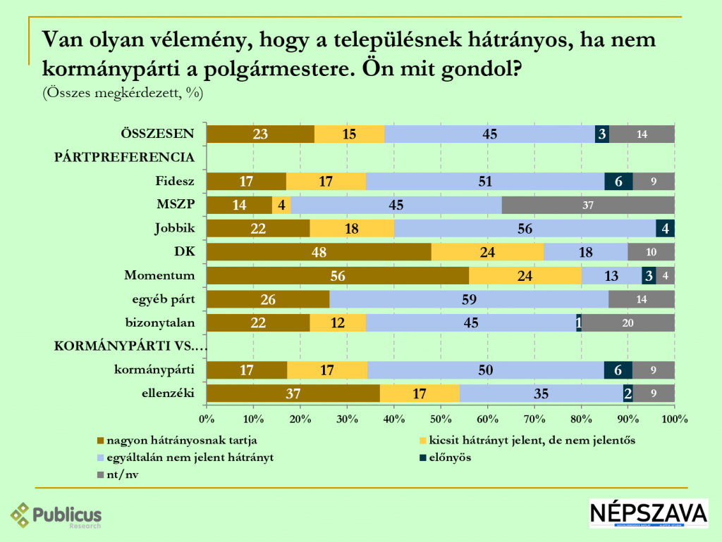 Tízből négyen (38 százalék) gondolják úgy, hogy egy településnek valamilyen szinten hátrányos, ha nem kormánypárti a polgármestere, ezzel szemben a megkérdezettek közel fele (45 százalék) szerint egyáltalán nem jelent ez hátrányt, míg 3 százalék szerint előnyös.