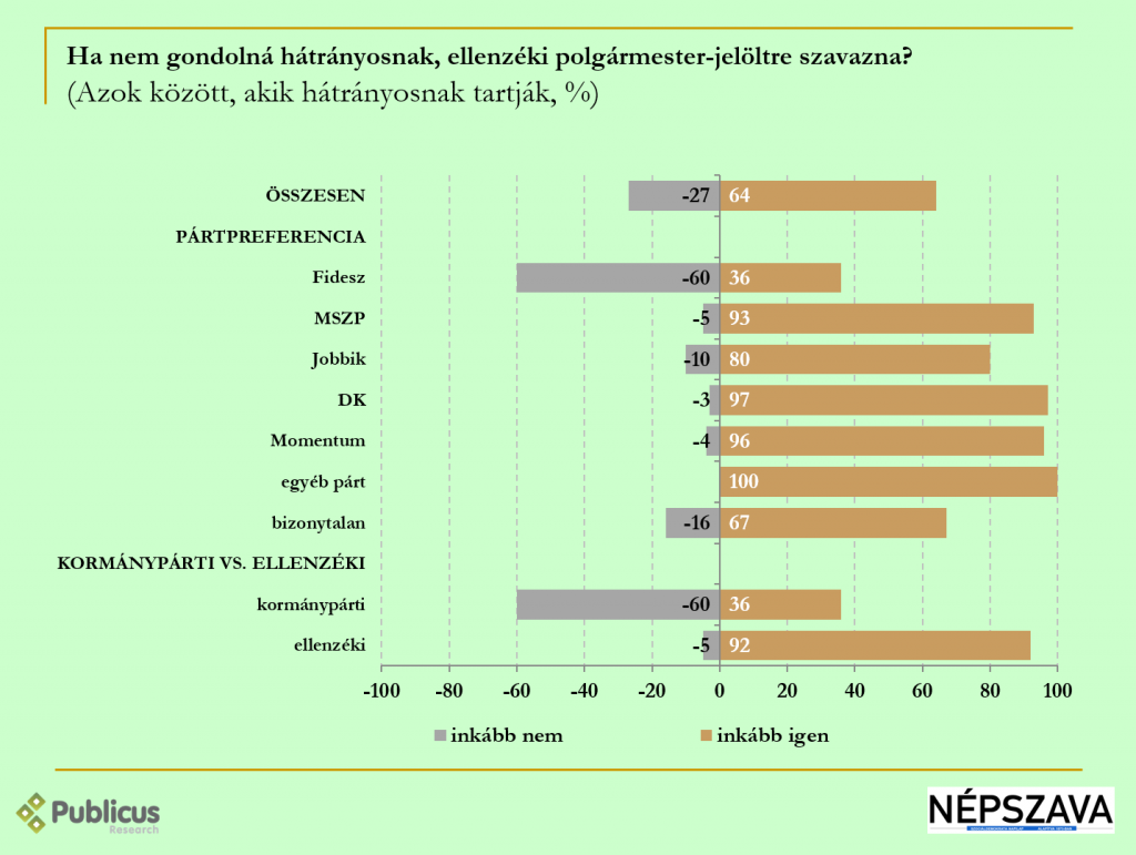 Gyökeresen más képet kapunk, ha nem gondolnák hátrányosnak az ellenzéki polgármestert: ebben az esetben a hátrányosnak gondolok kétharmada (64 százalék) ellenzéki polgármester-jelöltre szavazna, az ellenzék szavazók 92 százaléka, a Fidesz szavazók harmada (36 százalék).