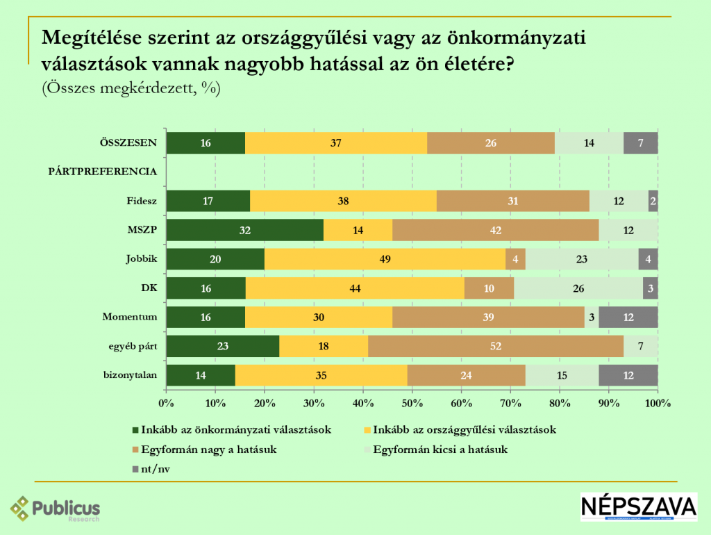 Leginkább a Jobbik, a DK és a Fidesz szavazók gondolják úgy (49, 44, illetve 38 százalék), hogy az országgyűlési választásoknak nagyobb a hatásuk, míg az MSZP és az egyéb pártok szavazói szerint (32 és 23 százalék) az önkormányzati egyénre gyakorolt hatása nagyobb. Egyben ezen pártok szavazói akiknél az önkormányzati választásokra adott válasz volt többségben.