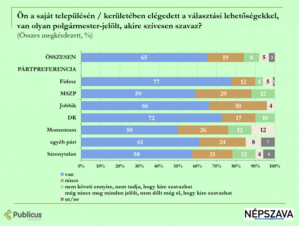 Leginkább a Fidesz és a DK szavazói érzik úgy (77 és 72 százalék), hogy elégedettek a jelöltekkel, legkevésbé a bizonytalanok és a Momentum szavazói (58 és 50 százalék). Leginkább a Jobbik és az MSZP szavazók (30 és 29 százalék) elégedetlenek a jelöltekkel.
