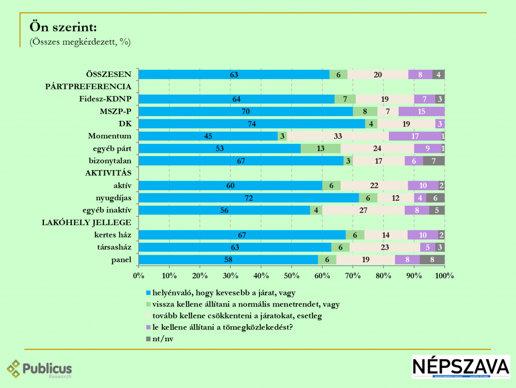 Az intézkedéssel leginkább a DK, az MSZP-P, és a Fidesz szavazói értenek egyet (74, 71 és 64 százalék). A járatok további csökkentését leginkább a Momentum és az egyéb pártok szavazói (33, illetve 24 százalék) látják indokoltnak.