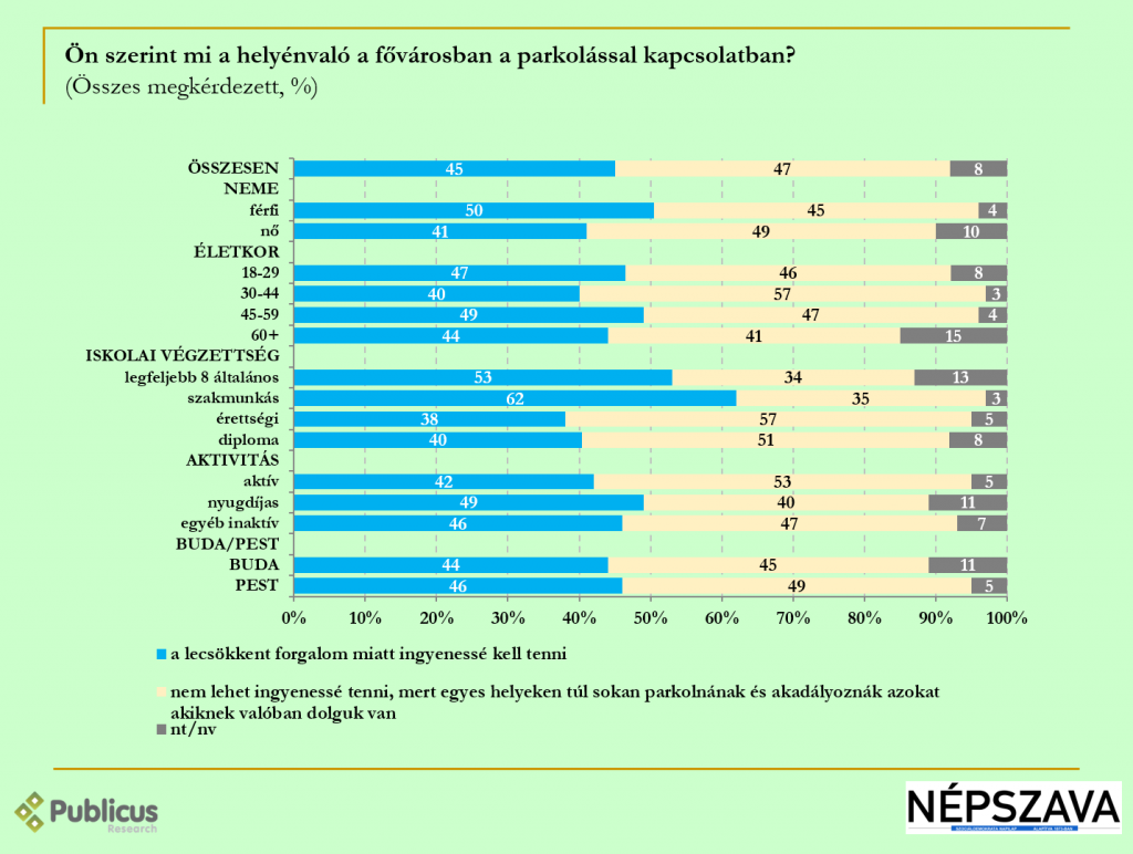 Figyelemreméltó, hogy az egyébként többet autózó aktívak körében is egyértelmű többségben (53 százalék, 42 ellenében) vannak azok, akik szerint nem kell ingyenessé tenni a parkolást, míg az inkább tömegközlekedést használó nyugdíjasok esetében fordított a helyzet (40 vs. 49 százalék).