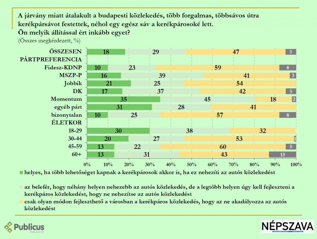 A kerékpáros közlekedést egyértelműen akár autós közlekedés kárára is leginkább a Momentum szavazók fejlesztenék (35 százalék), legkevésbé a bizonytalanok és a Fidesz szavazók (10-10 százalék).