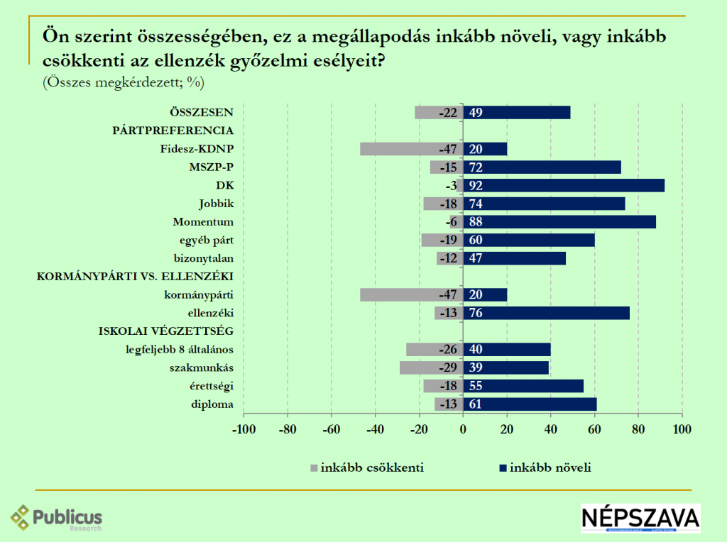Minden második (49 százalék) válaszadó szerint összeségében inkább növeli ez a megállapodás az ellenzék győzelmi esélyeit.