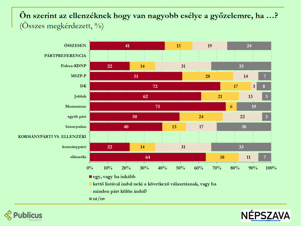 Tízből négy (41 százalék) megkérdezett szerint az ellenzéknek akkor van nagyobb esélye a győzelemre, ha egy listán indulnak. Minden ötödik (19 százalék) válaszadó szerint akkor, ha minden párt külön indul. Közel minden hetedik (15 százalék) megkérdezett úgy gondolja, hogy az ellenzéknek akkor van több esélye, ha két listával indul neki a következő választásnak.