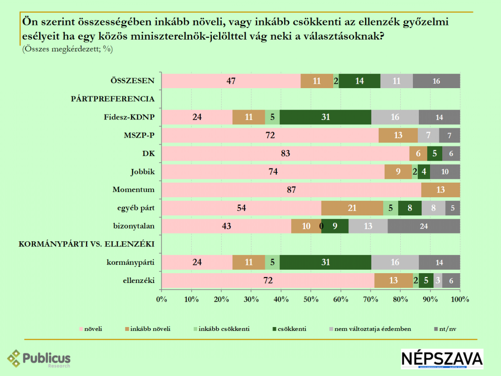 Tízből hét (72 százalék) ellenzéki szavazó szerint növeli, további 13 százaléknyi ellenzéki szavazó szerint pedig inkább növeli a pártok győzelmi esélyeit ha egy közös miniszterelnök-jelölttel vág neki a választásoknak. Még a Fidesz szavazók harmada (35 százalék) szerint is növeli (24 százalék), illetve inkább növeli (11 százalék) az ellenzék esélyeit, ha egy közös miniszterelnök-jelölt indul.