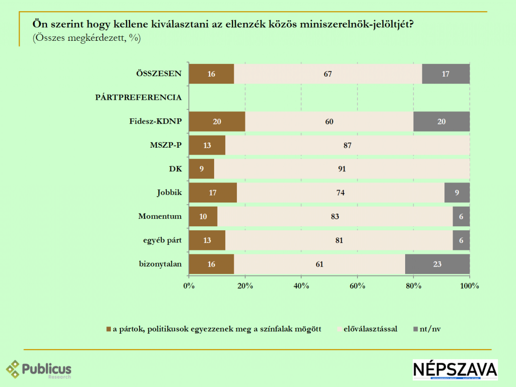 A megkérdezettek kétharmada (67 százalék) szerint előválasztással kellene kiválasztani a közös miniszterelnök-jelöltet. Közel minden hatodik (16 százalék) válaszadó szerint a pártoknak, politikusoknak kell megegyeznie a színfalak mögött abban, hogy ki legyen az ellenzék jelöltje.