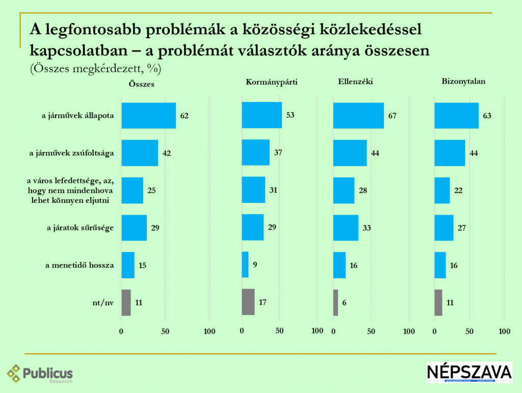 A közösségi közlekedés helyzetét részletesen vizsgálva látszik, hogy a legnagyobb gond a járművek állapota (62 százalék), a járművek zsúfoltsága (42 százalék), a járatok sűrűsége (29 százalék), valamint a város lefedettsége (25 százalék). Az egyes problémákról a vizsgált társadalmi csoportok jórészt hasonlóan gondolkodnak.